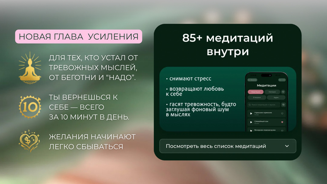 В «Усилении» тебя ждут 100+ медитаций и практик на все случаи жизни.