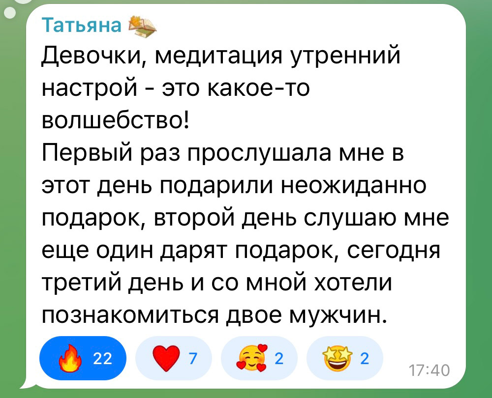 Есть короткие настройки на 5 минут — послушать перед свиданием или важной встречей. Есть глубокие практики — для вечернего погружения, очищения или перепросмотра.