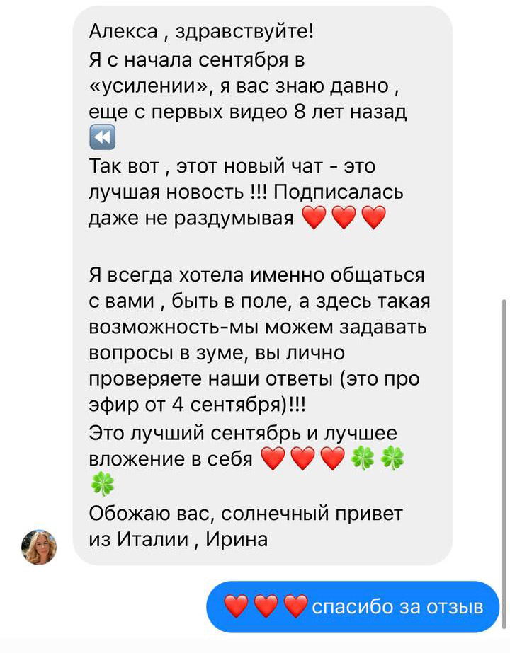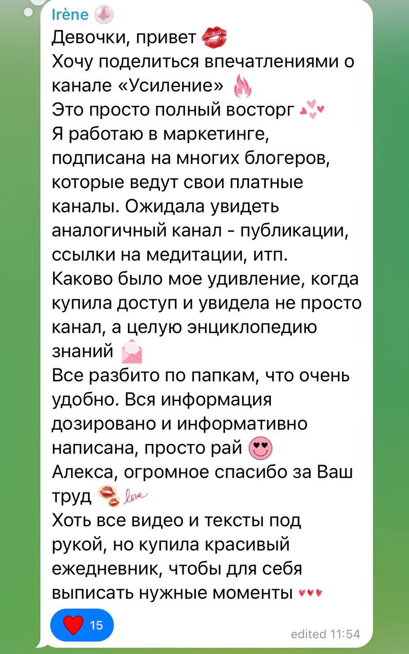 Да! Сразу после оплаты ты получаешь полный доступ: — к прошедшим эфирам с Алексой и кураторами — к базе медитаций — к схемам и практикумам под конкретные запросы