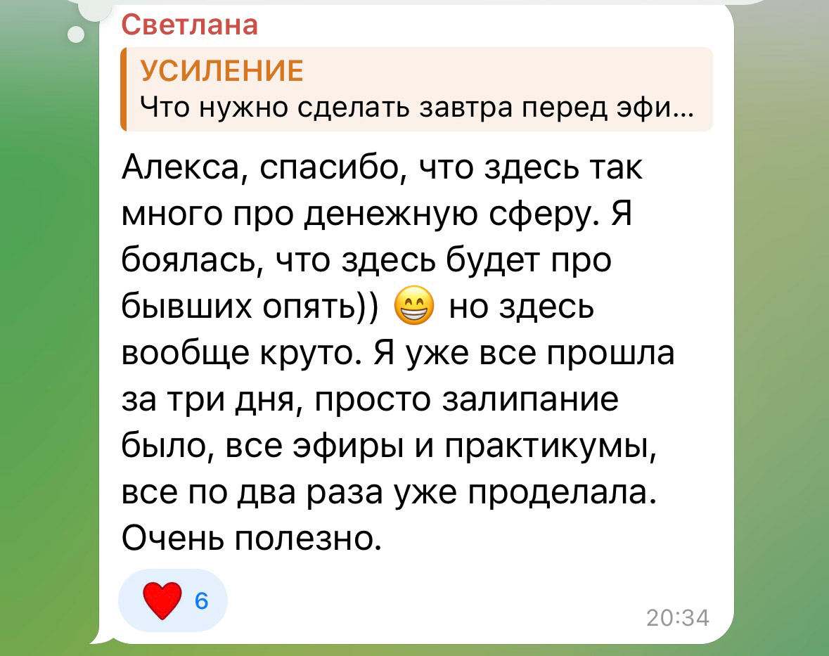 Есть чат поддержки, куда ты можешь написать. Есть эфиры, где мы отвечаем на вопросы. Есть кураторы, которые помогают тебе двигаться. Ты не одна. В Усилении поддержка на всех уровнях.